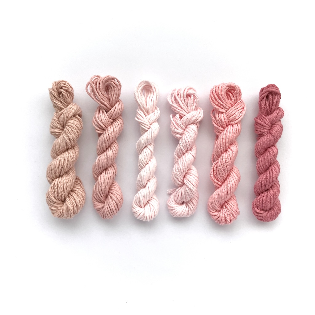 This selection of pink yarns is so pretty, and these mini skeins are perfect for making small motifs such as flowers and hearts, or for testing out a stitch with different weight yarns, or for freeform work, embellishment, and more.